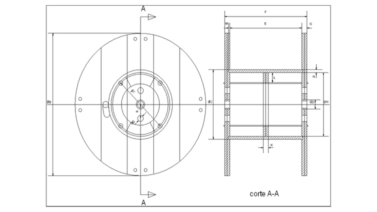 1. Este carretel pode ser fabricado com furo inclinado (Ø 50) ou com lesma (seccionada ou contínua). 2. No caso de carretel com lesma, o mesmo é fabricado com furos de amarração para fixação da ponta do cabo.