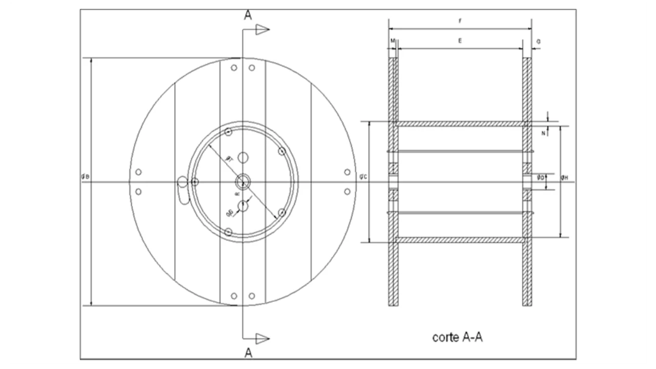 1. Este carretel pode ser fabricado com furo inclinado (Ø 63) ou com lesma (seccionada ou contínua). 2. No caso de carretel com lesma, o mesmo é fabricado com furos de amarração para fixação da ponta do cabo.